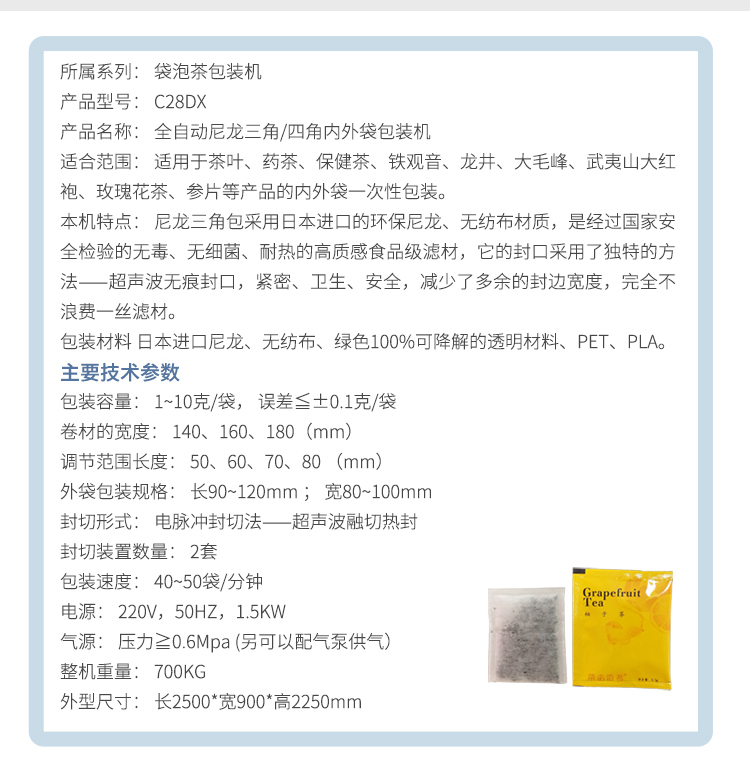 適合范圍: 茶葉、藥茶、保健茶等小顆粒物料的內(nèi)外袋一次性包裝。