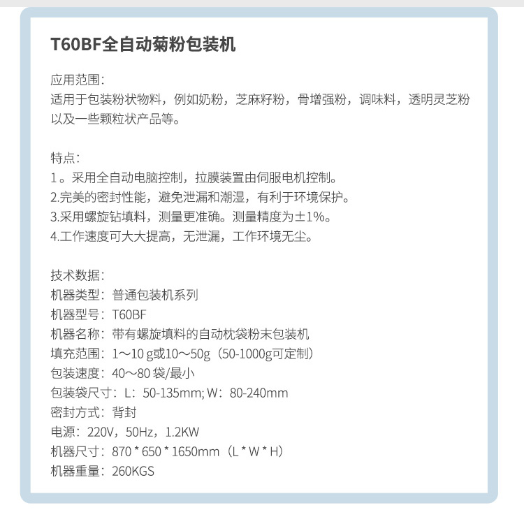 適用于包裝粉狀物料,例如奶粉,芝麻籽粉,骨增強(qiáng)粉,調(diào)味料,透明靈芝粉以及一些顆粒狀產(chǎn)品等。
