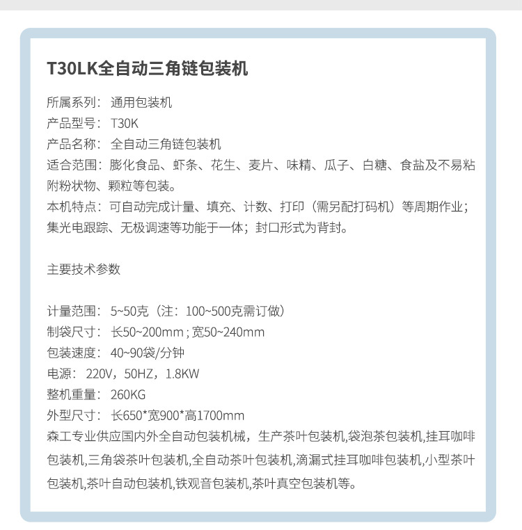 森工專(zhuān)業(yè)供應(yīng)國(guó)內(nèi)外全自動(dòng)包裝機(jī)械,生產(chǎn)茶葉包裝機(jī),袋泡茶包裝機(jī),掛耳咖啡包裝機(jī),三角袋茶葉包裝機(jī),全自動(dòng)茶葉包裝機(jī),滴漏式掛耳咖啡包裝機(jī),小型茶葉包裝機(jī),茶葉自動(dòng)包裝機(jī),鐵觀音包裝機(jī),茶葉真空包裝機(jī)等。