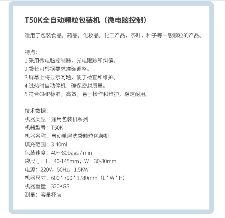 適合范圍: 廣泛應(yīng)用于食品、醫(yī)藥、化妝品、化工、茶葉、種子等小顆粒物品的包裝。