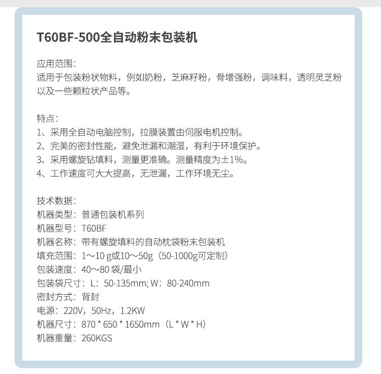 適用于醫(yī)藥、食品、化工等行業(yè)松散狀無(wú)粘性顆粒物料的中等劑量包裝。如:咖啡、洗衣粉、植物種子、味精、砂糖、干燥劑、花生米、膨化食品、食鹽等。
