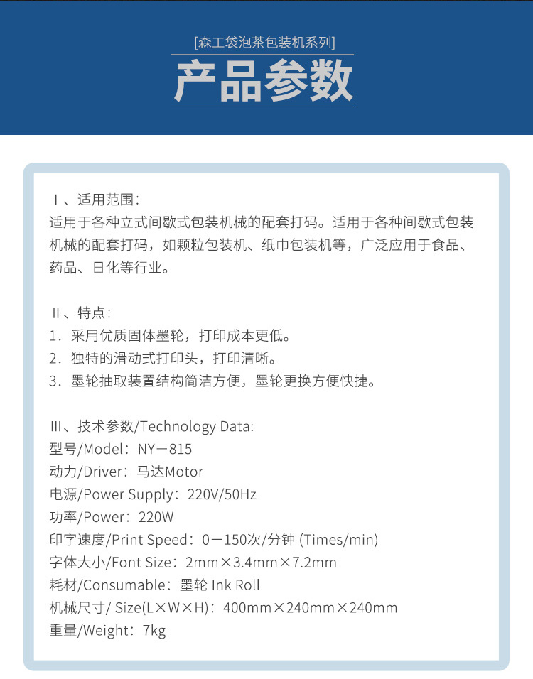 適用于各種立式間歇式包裝機(jī)械的配套打碼。適用于各種間歇式包裝機(jī)械的配套打碼,如顆粒包裝機(jī)、紙巾包裝機(jī)等,廣泛應(yīng)用于食品、藥品、日化等行業(yè)。